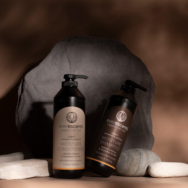 Includes the EverEscents signature blend of Organic Essential Oils and extracts; cinnamon leaf, patchouli, rosemary, horsetail, vetiver, nettle, sage, vitamins E and B5.